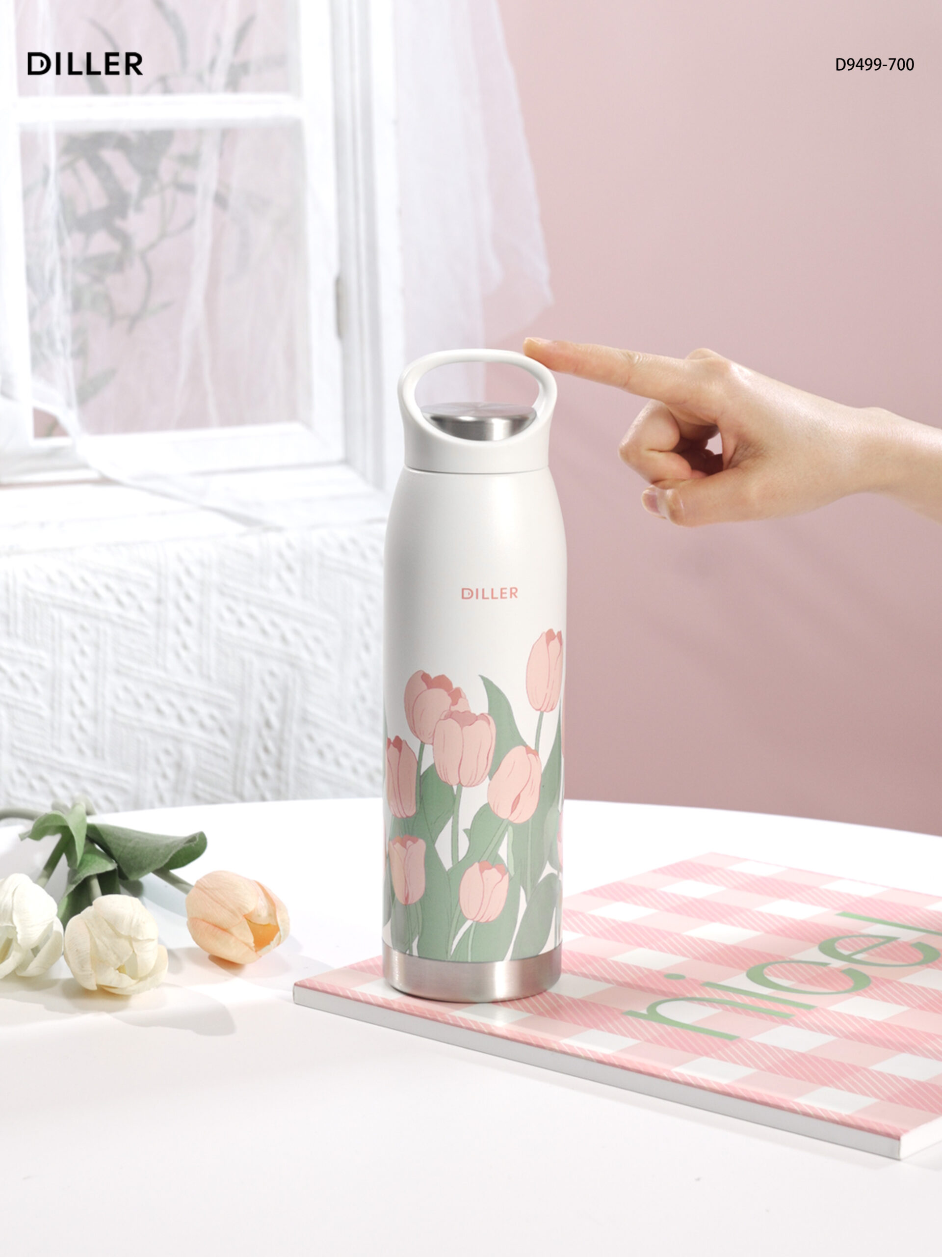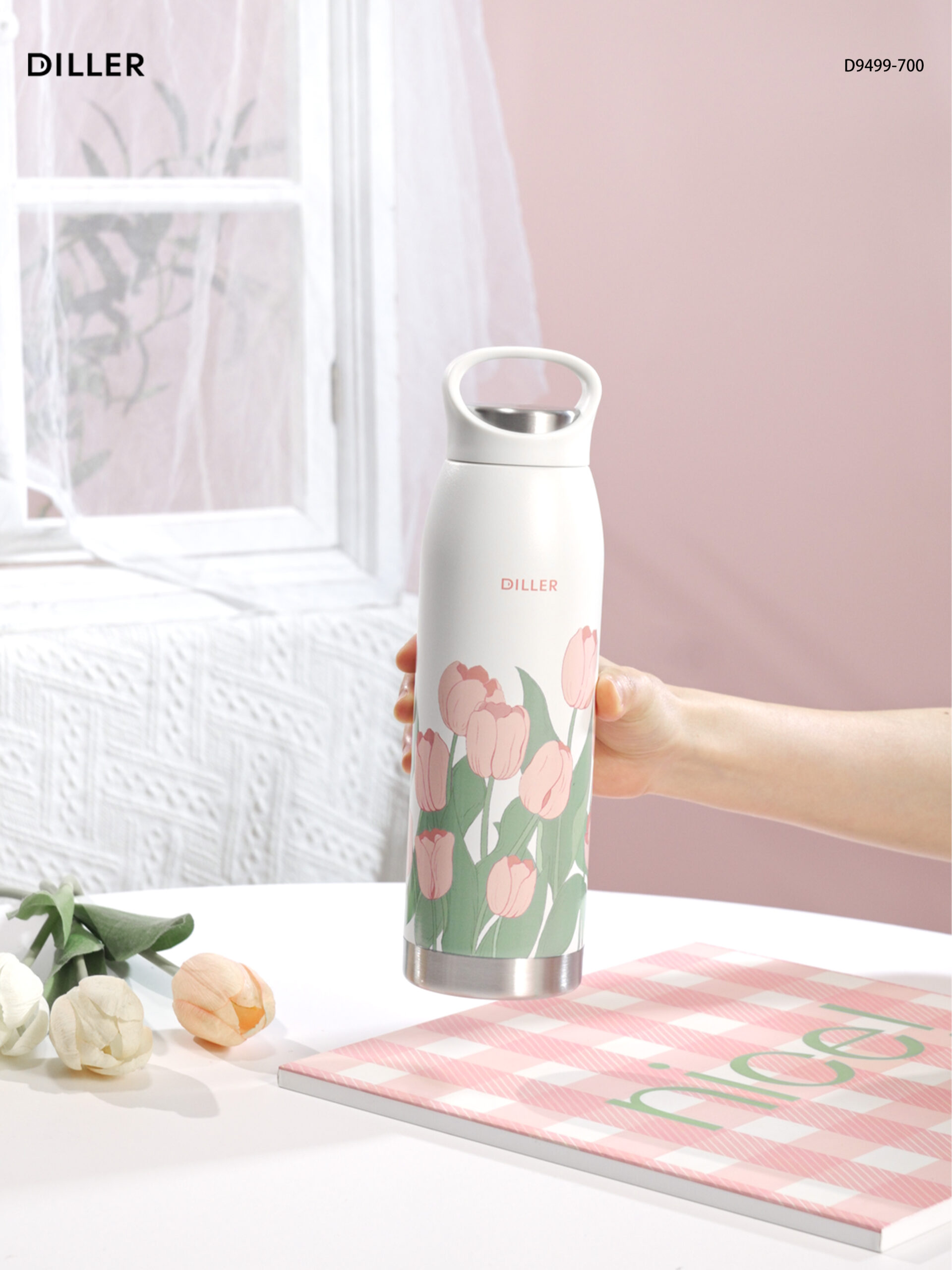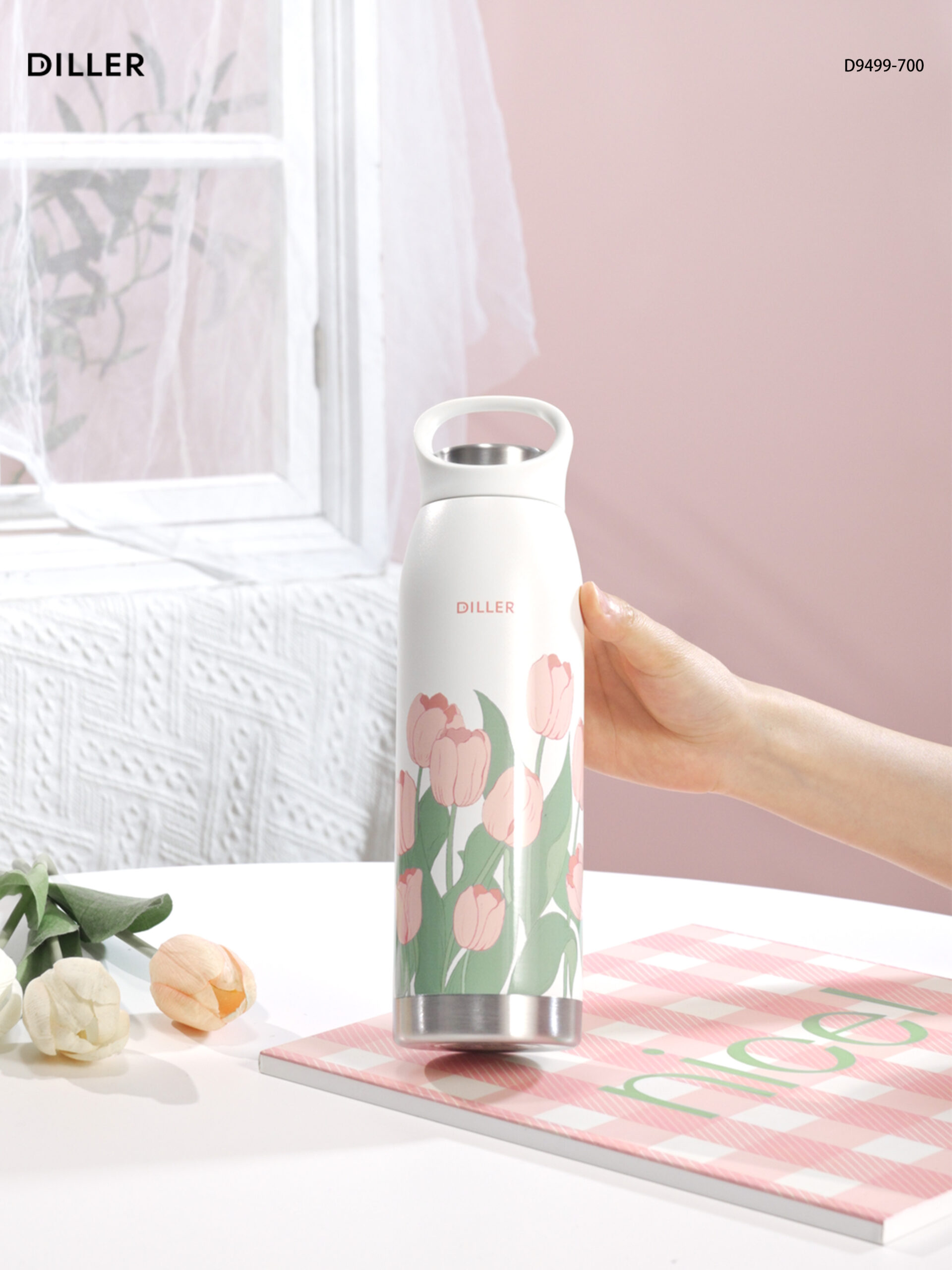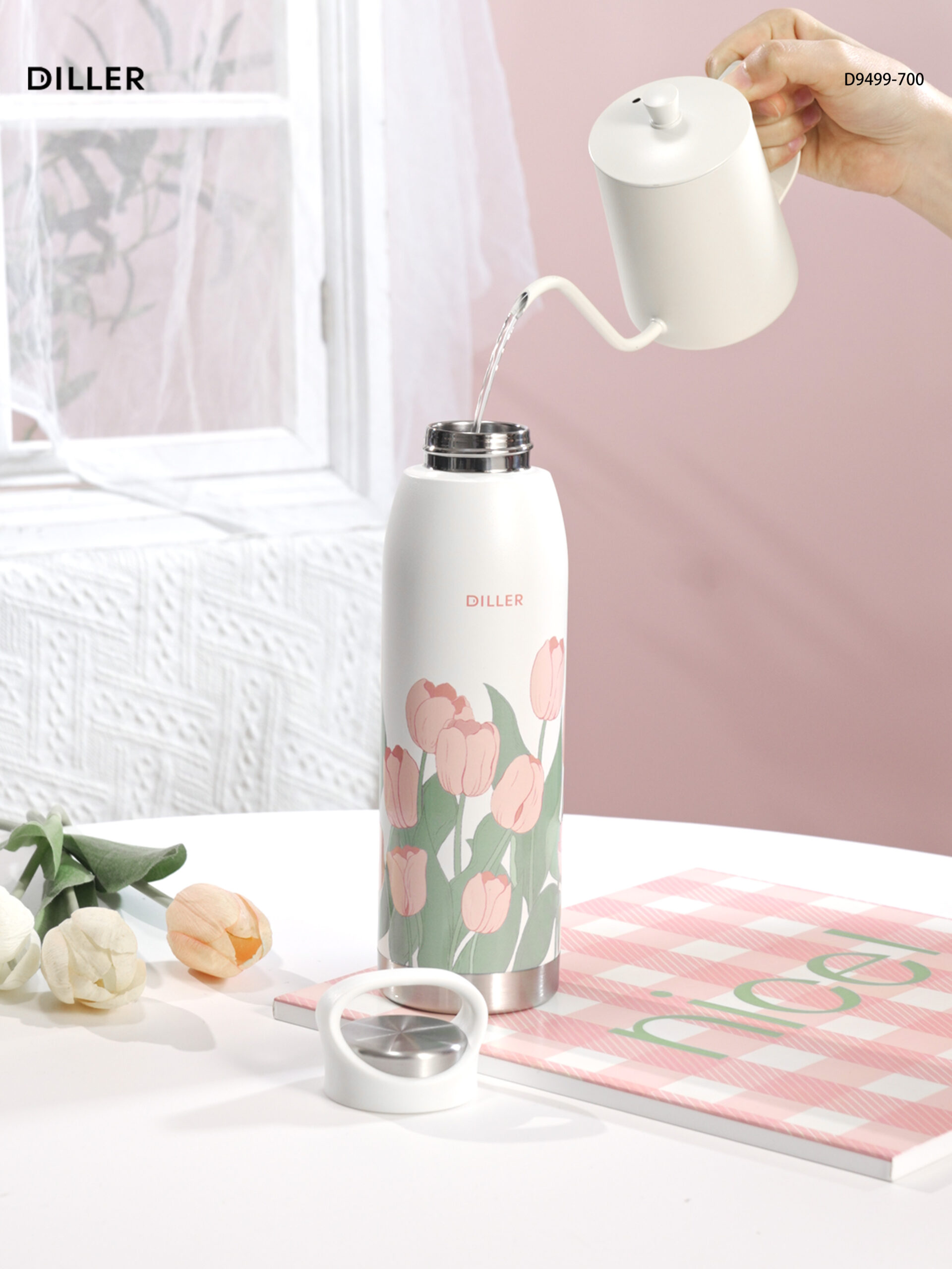 Home Tulip 2026 Diller Tulip Flower 304 Stainless Steel Vacuum Flask Bottle Tumbler Lid Keep Cold Hot D9499-700ml